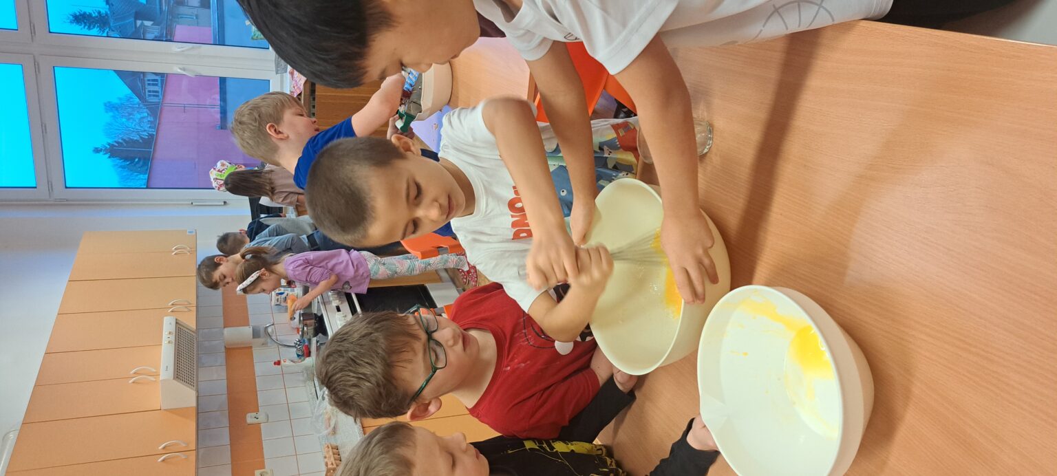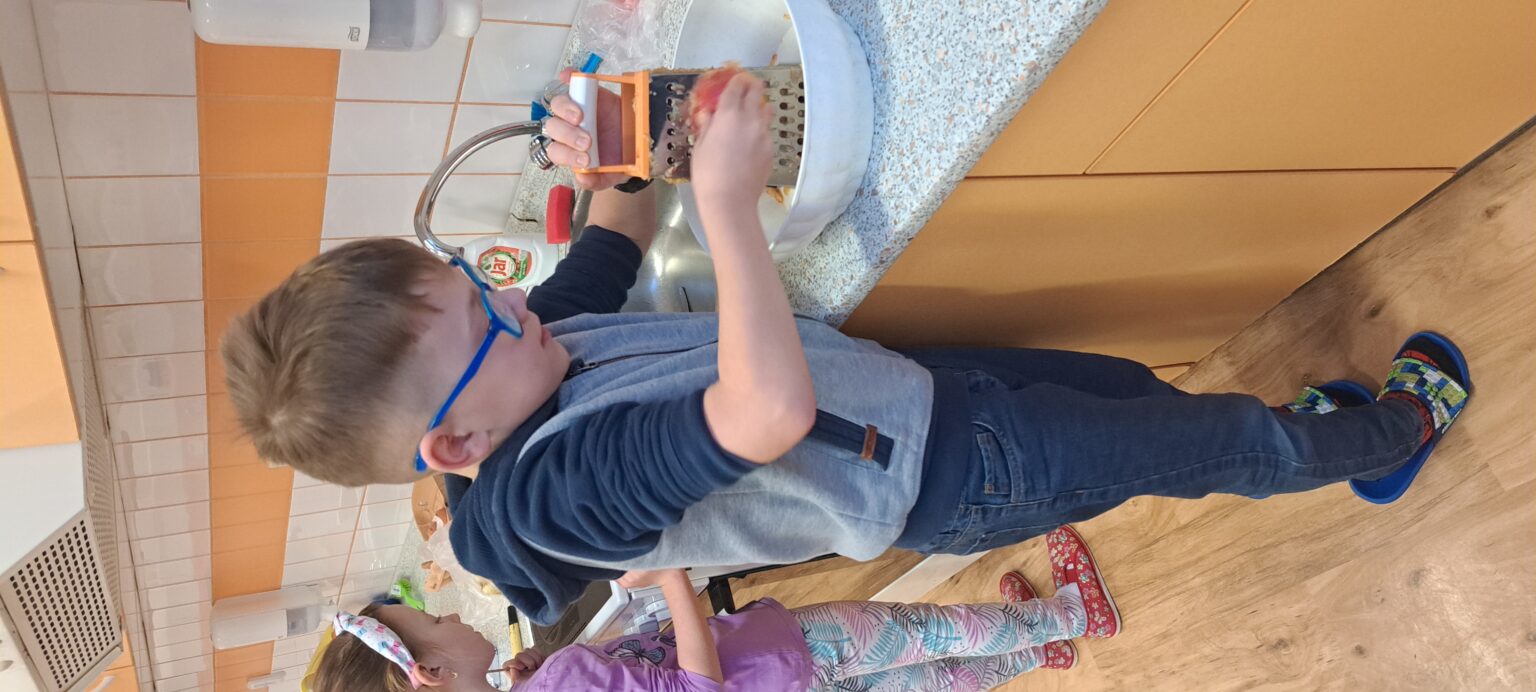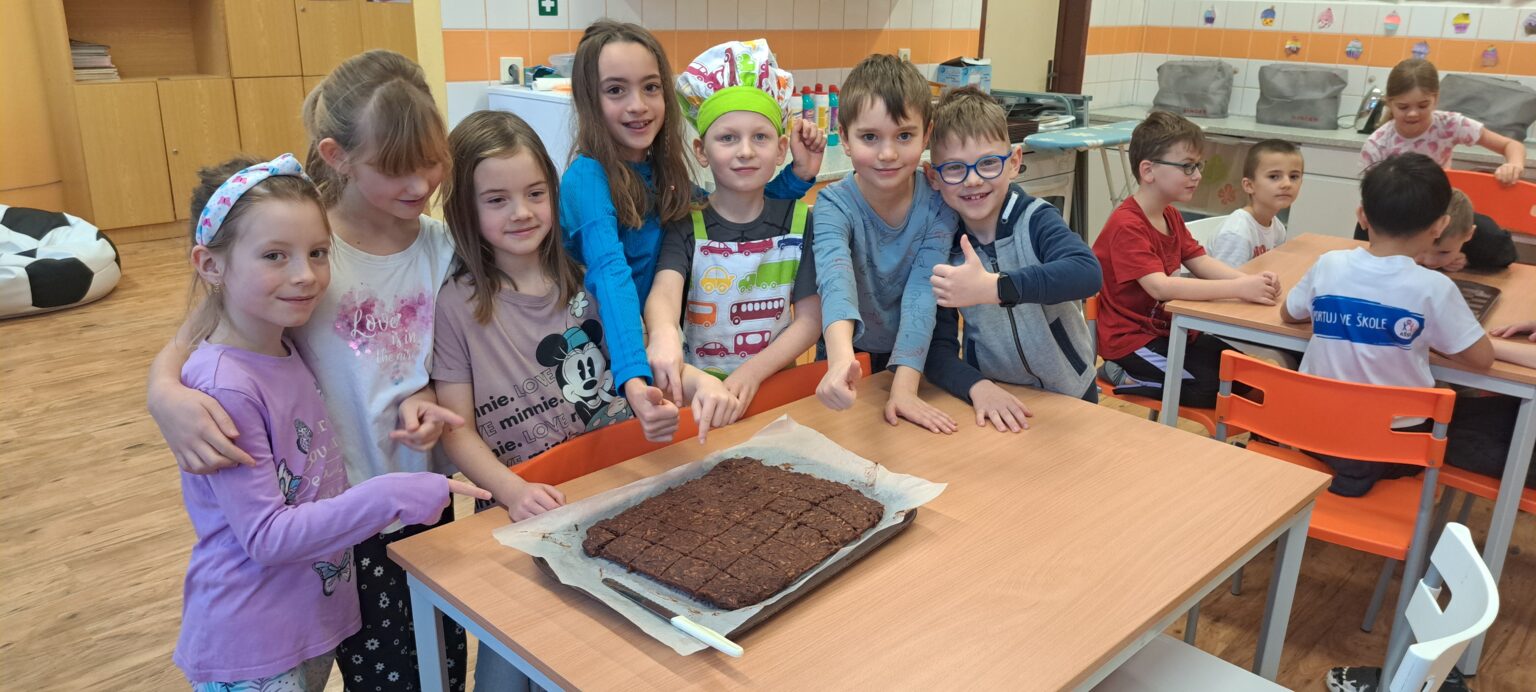 Žáci ze 2. A si v pátek vyzkoušeli přenést teoretický výsledek slovní úlohy z matematiky do výsledku praktického. Během přípravy na násobilku řešili recept na jablkový koláč. Jeho ingredience museli postupně přepočítávat na více porcí. Od toho už byl jen krůček k ověření, zda recept funguje. Proto jsme se přesunuli do cvičné kuchyně, rozdělili se do dvou týmů a mohlo se začít. A výsledek? Ze dvou plechů koláče nezbyl ani jeden kousek!