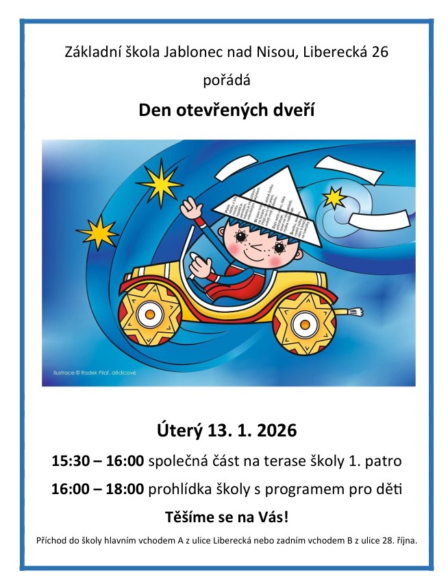 Srdečně zveme všechny zájemce, zejména budoucí prvňáčky a jejich rodiče, na den otevřených dveří v úterý 13. ledna od 15.30 do 18.00 hodin.