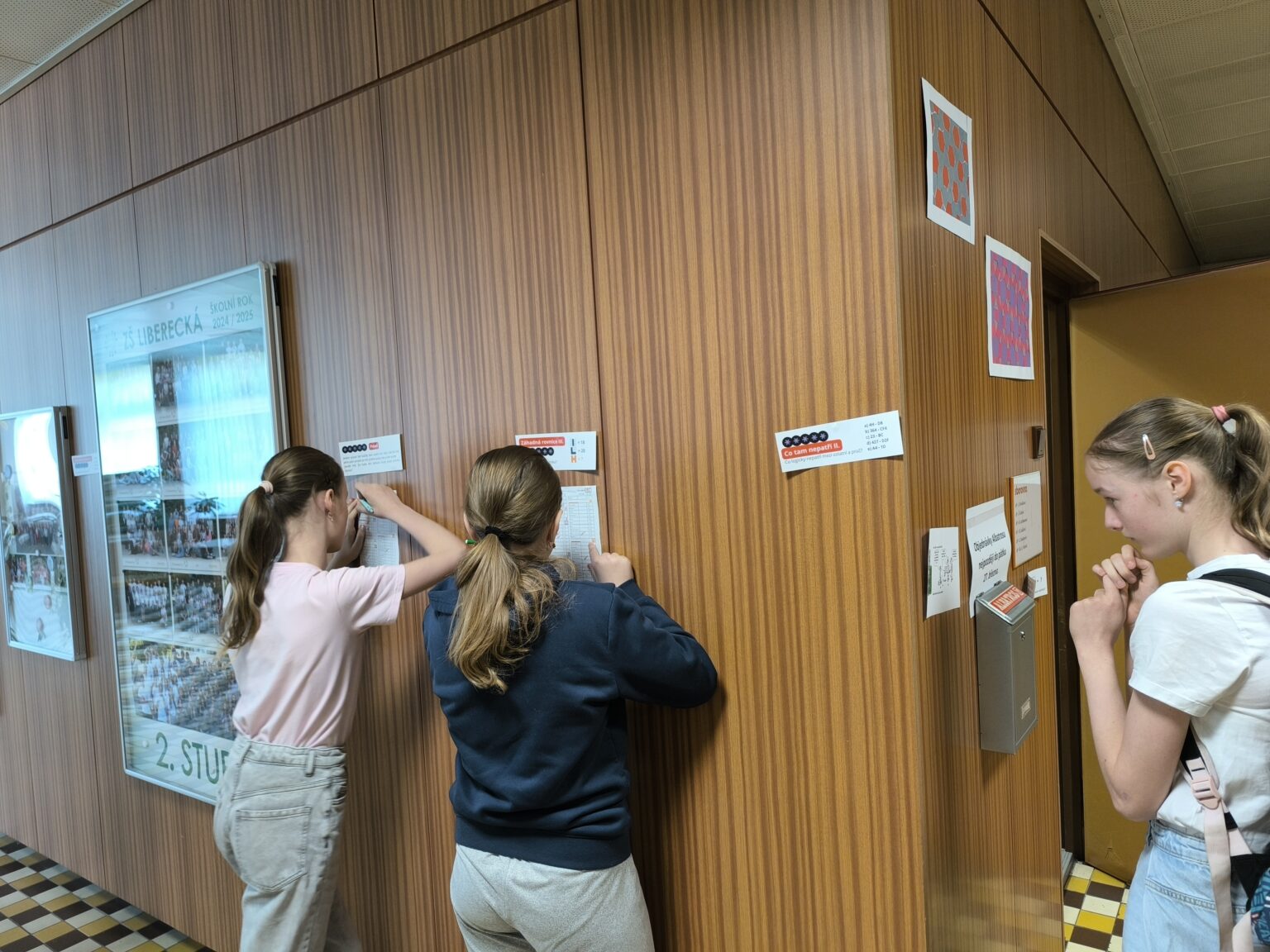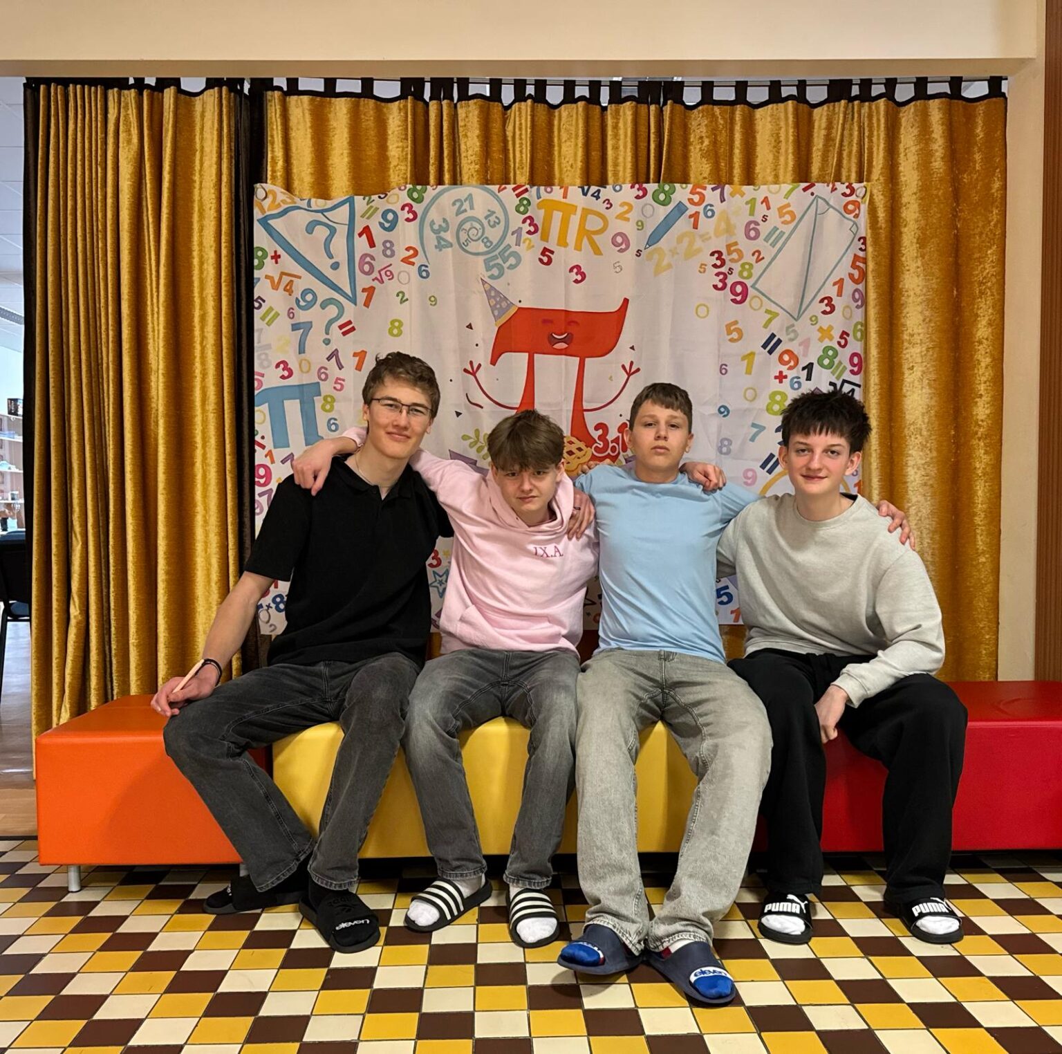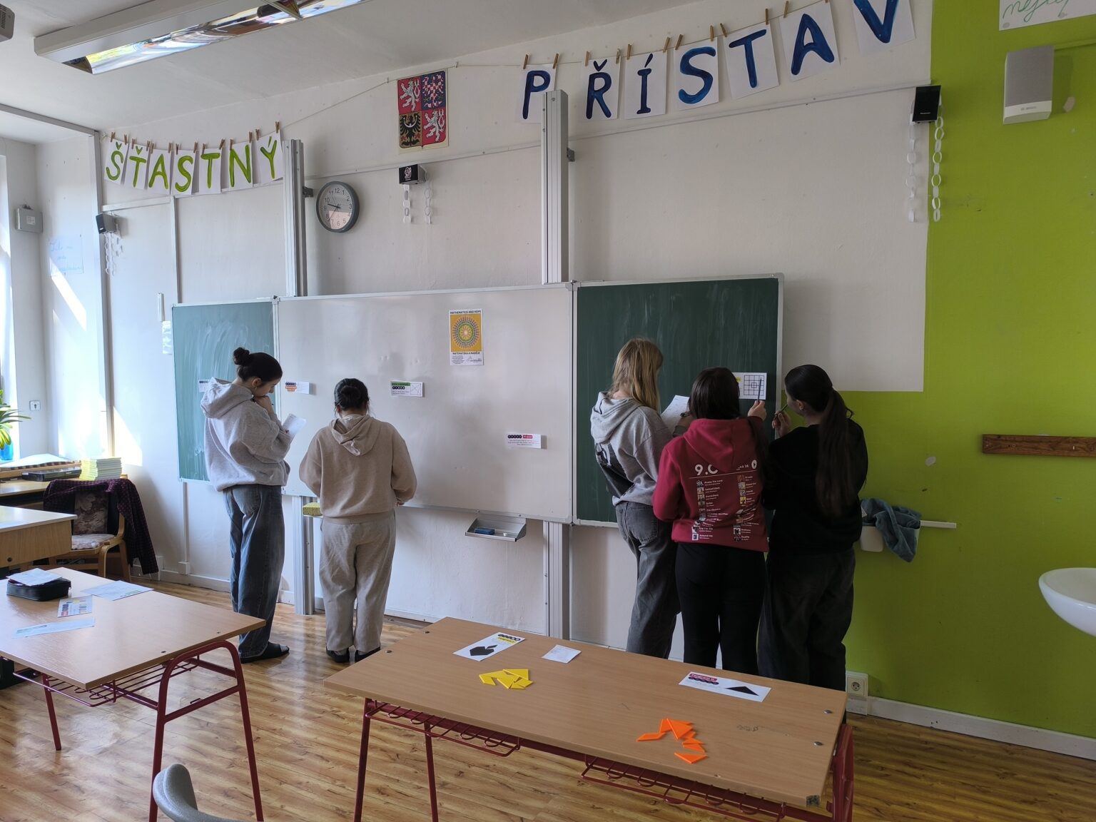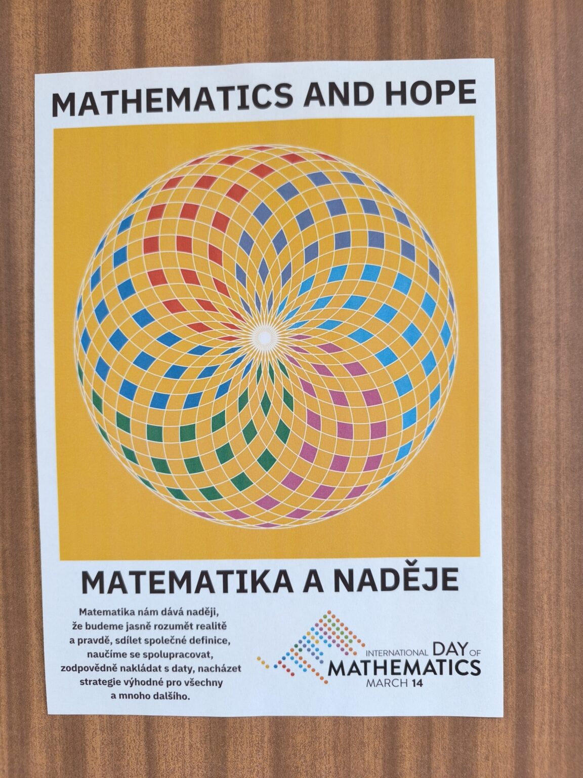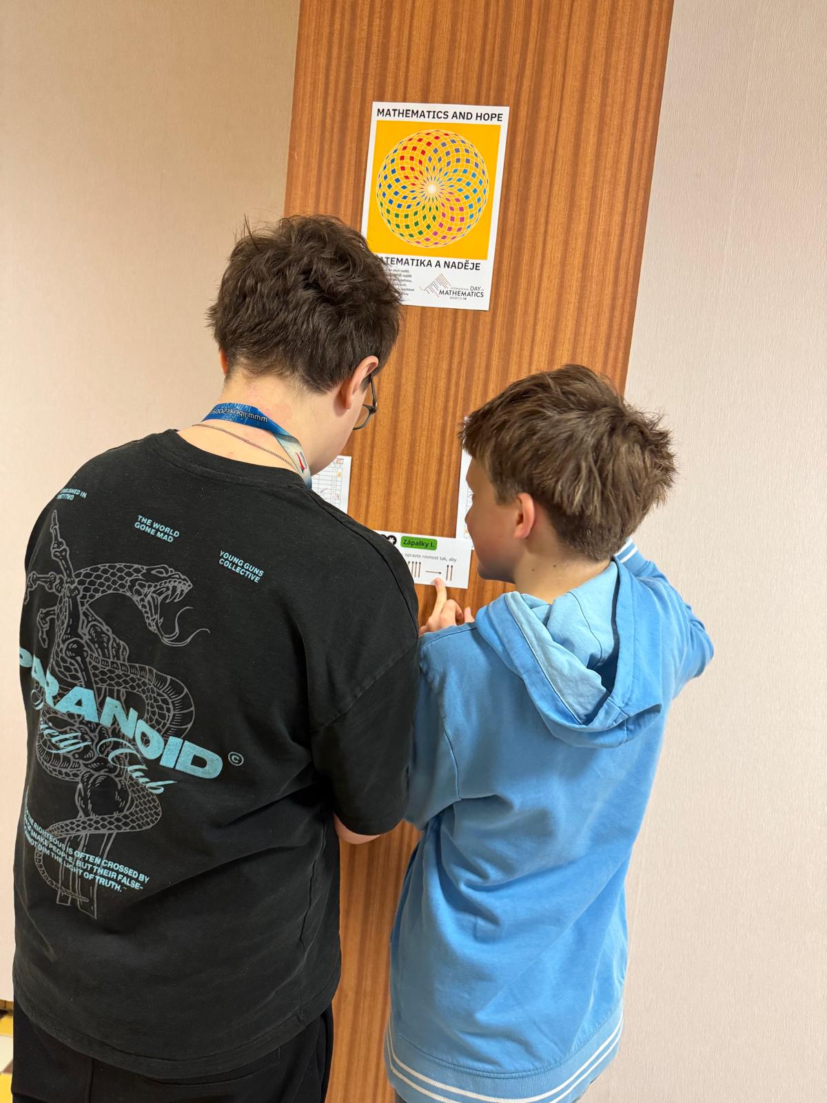 Dne 14. března byl Mezinárodní den matematiky neboli Den čísla Pí (3,14). Tento den byla ale sobota, a tak jsme ho v naší škole oslavili ve středu 18. března. Během tohoto dne se celý druhý stupeň zapojil do různých matematických aktivit. Ty byly rozděleny na dvě části. V té první jsme počítali různé úlohy a řešili logické hádanky. Druhá část byla spíše kreativní – museli jsme totiž stříhat, lepit, barvit, společně jsme tvořili panorama podle cifer v čísle Pí a skládali slova s použitím názvů písmen řecké abecedy. Tento den jsme si v některých třídách připomněli i v hodinách výtvarné výchovy a tvořili jsme mozaiky s využitím tzv. teselace (česky též parketování), což je geometrický princip, kdy se plocha vyplňuje jednou či dvěma opakujícími se dlaždicemi. A pak jsme měli ještě jeden úkol – spočíval v tom, kdo si zapamatuje co nejvíce čísel za desetinnou čárkou v čísle Pí. Hrdou vítězkou této soutěže se stala Lucie Hubková z 9. A, když si zapamatovala neuvěřitelných 45 číslic za desetinnou čárkou. Dále bylo vyhlášeno a odměněno deset nejúspěšnějších řešitelů logických úloh z celého druhého stupně, kterými byli Hugo Kracík, Michal Šmíd, Jan Čapoun, Anna Dostálová, Eliška Sobotíková, Patrik Herrmann, Anna Smolíková, Marie Dubcová, Vít Gola a Jakub Hrách.