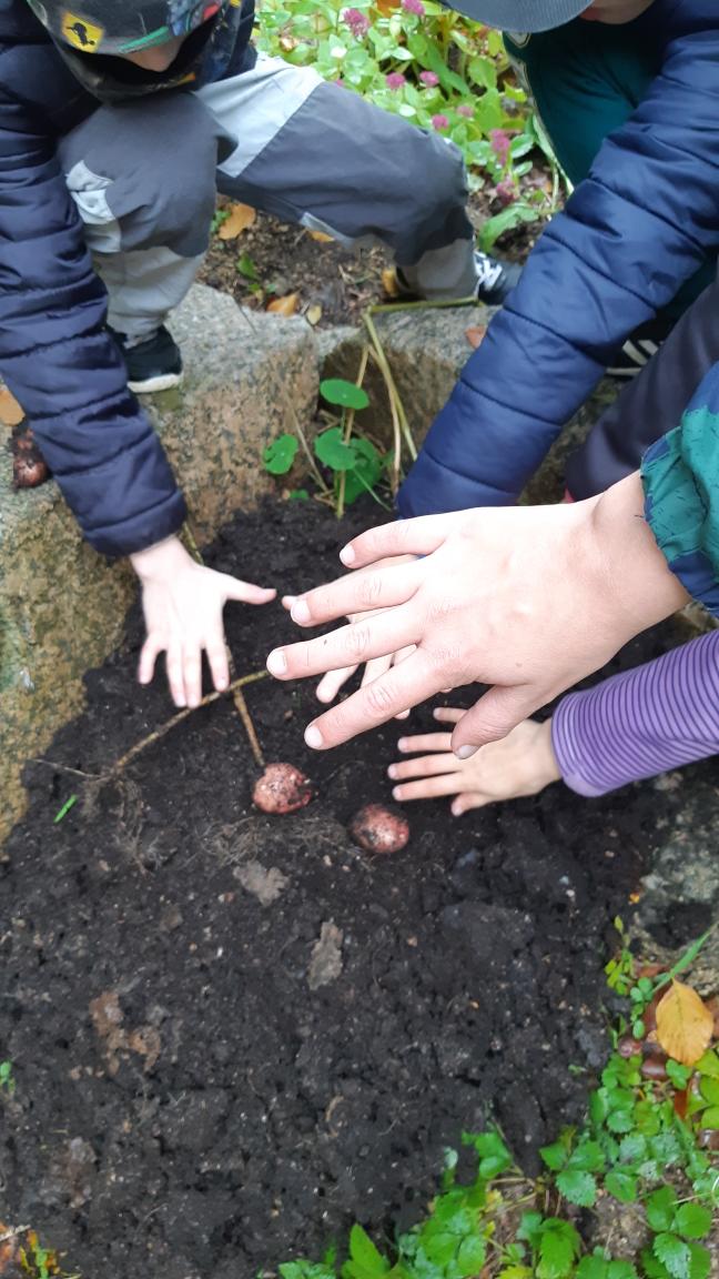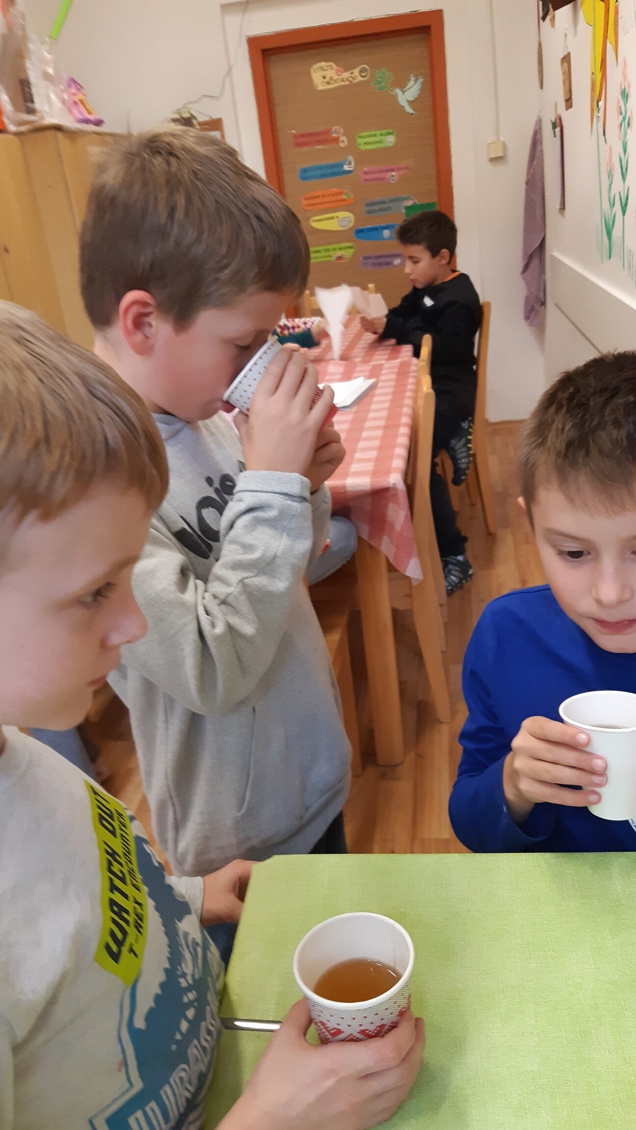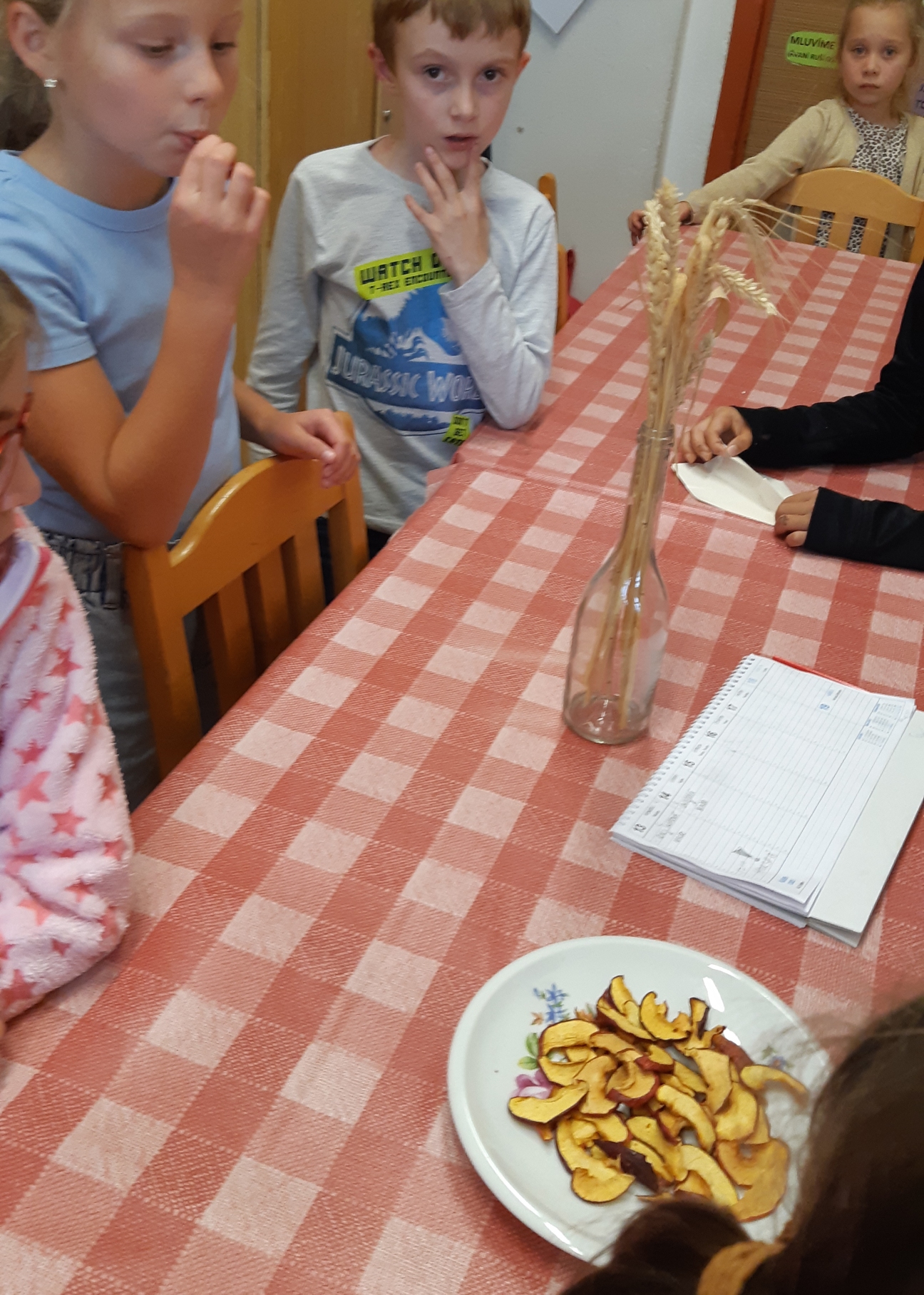 Děti ze 7.oddělení si vyprávěly, co všechno se sklízí na podzim. V rámci toho si usušily ze sklizených jablíček křížaly, ze sklizené máty jim paní vychovatelka uvařila čaj a na školním pozemku sklidily pár brambor.